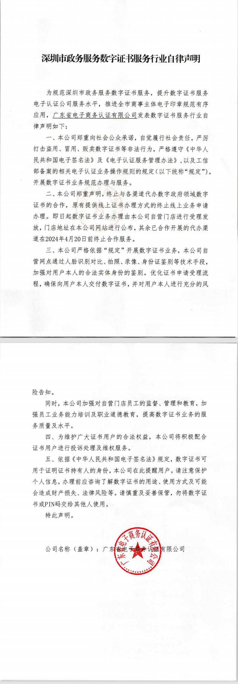深圳市政務服務數字證書服務行業自律聲明